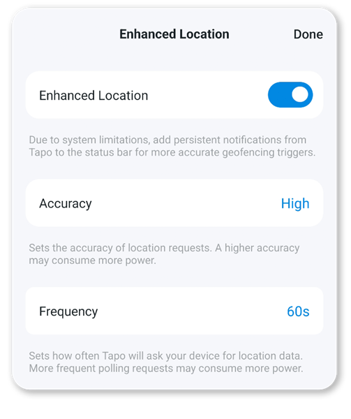 Frequency: The frequency will change how often your device reports its location to the Tapo app. If you find that your automations do not fire on time or you are using the feature to detect areas that are close together, decreasing the time between updates may improve your experience.