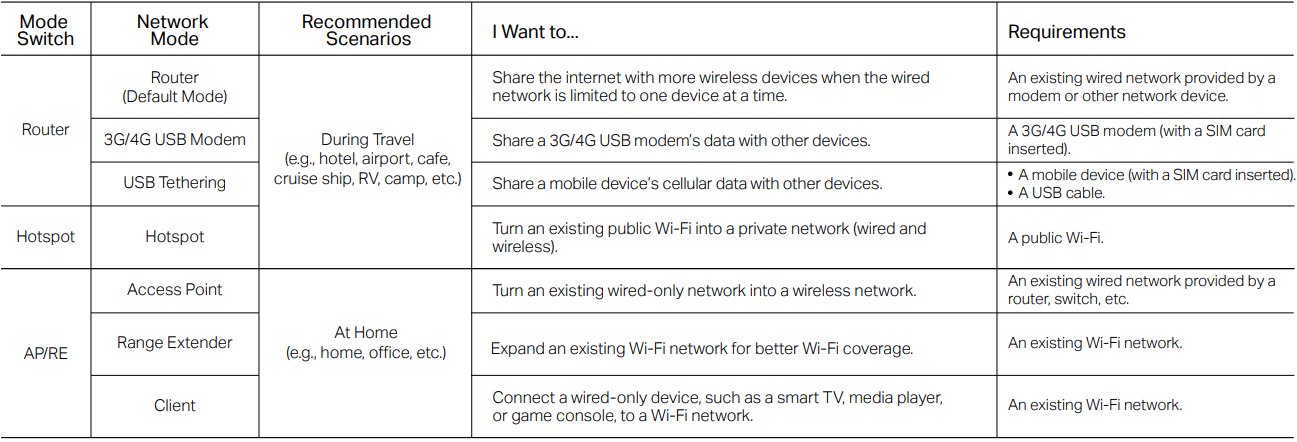 You can switch between the different modes with the switch on the side of the device. After moving the switch, the device will take a few minutes to reboot into another mode, and you will need to log into tplinkwifi.net to configure the device to the new operating mode.